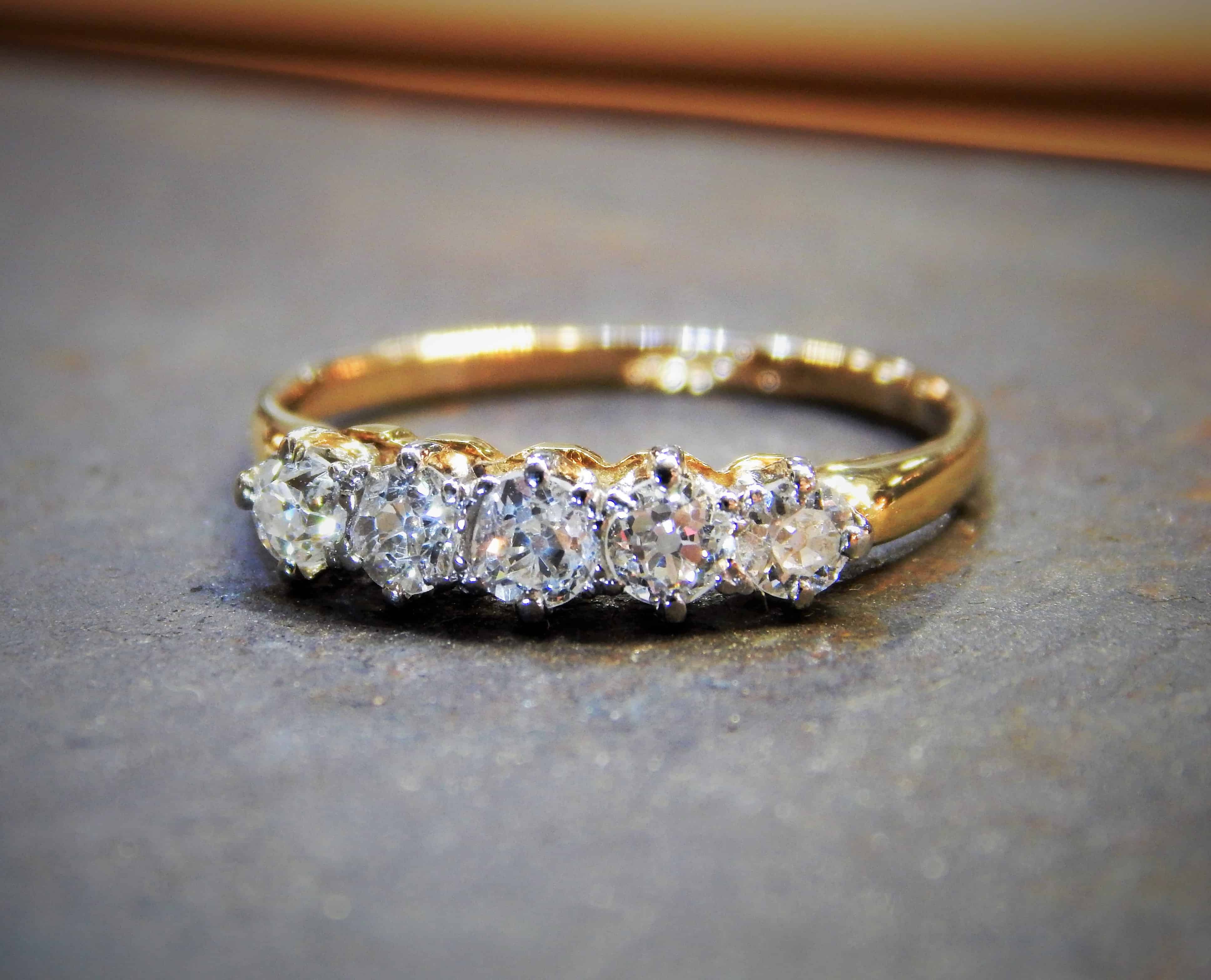 Elegant Platinum & 18ct yellow gold 5 old cut diamond half hoop ring. These diamonds are graduated in size set within a Platinum claw setting which accentuates these beautiful stones. This type of setting allows light to the diamonds so that they can sparkle even more.